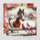 Cartão de Natal personalizado para a agricultura, com um bonito cavalo marrom e branco pintado com um cardeal macho e fêmea na cerca com um celeiro rústico no fundo de uma arte de aquarela de inverno nevada.