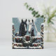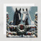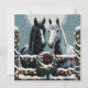 Bonito cartão de Natal com os gráficos de um cavalo branco e de um cavalo preto parado numa esteira de madeira decorada em passas de férias e bonito luzes de Natal cintilantes cobertas de neve. Estes cavalos são feitos em um estilo de arte pop de quadrinhos para invocar um sentimento nostálgico.