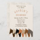 Diversão de aniversário para seu filho ou filha amante de cavalo! Silhuetas de cavalo coloridas em tons de marrom, laranja e creme adoram este convite de aniversário. Personalize com as informações do seu filho.