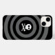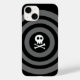 Design de arte gráfica monocromática de um crânio bonito e ossos cruzados com círculos pretos e cinzas.