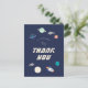 Um obrigado espacial que você postcard com ilustração fofa de planetas, estrelas fotografadas, alienígena, nave espacial e ônibus espacial, todos orbitando deste mundo. Este postal faz parte da coleção de festas de aniversário de Celebração Cósmica disponível por Lisa McLean Design. Espero que goste.