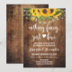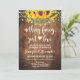 Convite de casamento de fuga com base de madeira rústica, luzes de fada e girassóis. Torne-o seu adicionando seu texto (e fotos pessoais). Para acessar ferramentas avançadas de edição, vá para “Personalizar”, role para baixo e pressione o link "clique para personalizar ainda mais". Para mais designs correspondentes, clique no link “Outros produtos desta coleção”.