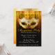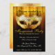 Celebração de Festa com Fantasia Convite Dourado Elegante. Um convite elegante e sofisticado com uma máscara de fantasia em tom dourado com detalhes pretos, um fundo em tom dourado com um padrão damasco sutil sobreposto em preto e tipo fancy personalizável para os detalhes da sua festa.