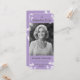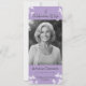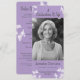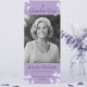 Uma elegante Celebração do Life Card adornada com flores brancas delicadas contra um pano de fundo roxo suave e sereno. Um belo e significativo tributo para honrar e estimar a memória de um ente querido.