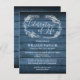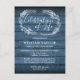 Uma celebração rústica do convite de lembrança da vida, com um cartão postal com uma folhagem desenhada à mão sobre um fundo de painéis de madeira azul. Projetado por Thisnotme©