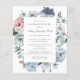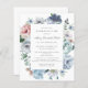 Flores azuis empoeiradas criam um belo quadro floral para seu convite ao funeral. O nome da pessoa morta está escrito em um texto tradicional. Todo o texto pode ser facilmente editado para criar uma lembrança pessoal.