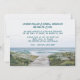 Anúncio de casamento com vista para o oceano em cartão plano com texto modelo. Uma passarela rústica através das dunas leva a um mar azul calmo neste design para todos os casais que têm uma cerimônia de casamento particular. Todo o texto está acima do design em dois lugares. Inclui os nomes de cada pessoa com texto de anúncio como “se casaram”, “são agora Sr. e Sra.” etc. e preencha o parágrafo com informações sobre a cerimônia. Além disso, convide familiares e amigos para uma festa de recepção para o casal de recém-casados, se desejar. O verso tem a mesma imagem costeira.