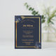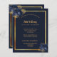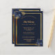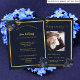 Um fundo azul marinho, uma falso estrutura dourada. Decorado com flores azuis. Personalize e adicione nome, datas e texto. Adicione uma foto atrás.