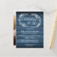 Uma celebração rústica do convite para lembrança da vida, com um cartão postal com uma folhagem desenhada à mão sobre um pano de fundo de madeira azul e foto no sentido inverso. Projetado por Thisnotme©