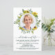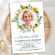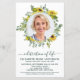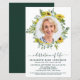 Convite de Funeral / Celebração da Vida Memorial Moderno de Girassol & Eucalipto. Esses convites de funeral de condolências apresentam uma foto em um desenho de coroa de girassol e eucalipto. Personalize este convite de celebração da vida funeral com as fotos de seus entes queridos, nome & datas, detalhes do evento. DIREITOS AUTORAIS © 2021 Judy Burrows, Black Dog Art - Todos os Direitos Reservados. Convite de Celebração da Vida com Foto de Girassol Eucalipto