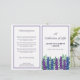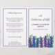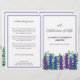 Programa fúnebre floral em branco com fontes roxas escuras, verde e flores azul e roxa. Por trás você pode escrever o obituário e o programa. Dobre você mesmo para um programa prático.