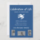 Celebração do evento do memorial Life convite totalmente personalizável. Dove of Peace design em branco, mostrado em azul, mas você pode mudar a cor de fundo aqui se quiser. Substitua as imagens de fotos por suas próprias ou exclua-as se não forem necessárias. Personalizar todo o texto. A celebração de um evento de vida é uma forma maravilhosa de partilhar memórias e prestar homenagem a um familiar ou amigo, quer em complemento, quer em vez de um serviço fúnebre tradicional.