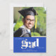 Anúncio de graduação e convite de festas do design azul na moda. Personalize com sua foto de mais velho, o nome e o nome da escola. Adicione os detalhes da sua festa de formatura à parte traseira do cartão e envie um e-mail para a família e os amigos para convidá-los a celebrar o formando.