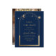 Azul Celestial Salva a Data Aniversário Quinceanera Invitation apresenta um sol dourado, lua e estrelas num fundo azul. Dentro é a sua Quinceanera personalizada para guardar as informações da data e, no verso, adicionar a sua foto favorita. Personalize editando o texto nas caixas de texto. Projetado por ©2024 Evco Studio www.zazzle.com/store/evcostudio