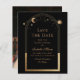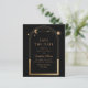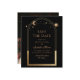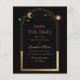 Célestial Black Save The Date Birthday Quinceanera Invitation apresenta um sol dourado, lua e estrelas num fundo preto. Dentro é a sua Quinceanera personalizada para guardar as informações da data e, no verso, adicionar a sua foto favorita. Personalize editando o texto nas caixas de texto. Projetado por ©2024 Evco Studio www.zazzle.com/store/evcostudio