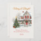 Traga a magia das festas para os seus cumprimentos com este encantador cartão de Natal apresentando uma aconchegante casa vermelha decorada com guirlandas, laços e uma árvore lindamente iluminada coberta de neve.