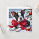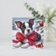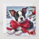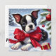 Um fofo de Boston Terrier vestindo um arco vermelho sob neve ao lado de decorações de feriados evoca alegria festiva.