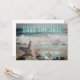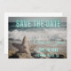 Moderno e não tradicional O anúncio Save the Date apresenta cena de praia silenciada (que inclui ondas e estrelas na areia) como pano de fundo da fotografia com Save the Date em néon azul aqua. Personalize com detalhes do casal de casamento.
