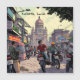 Imagem ai do estilo quadrinhos da área de centro de Kolkata, Índia, Motocicletas estacionadas e cartas. Um ímã com ilustração de movimentada rua de centro com edifícios, restaurantes, compras e pessoas nas suas motos.