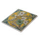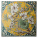 Azulejo de vindima com arranjo floral com um ramo de flores brancas e folhas verdes, colocado sobre um fundo amarelo redondo, rodeado por uma borda decorativa branca sobre o chão.
