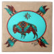 Brilhe sua casa com este único "Um dos tipos" Azulejo cerâmico de Buffalo no Sudoeste! Ele apresenta um Buffalo Sudoeste... cercado por uma borda da fama Turquesa, Negra e Laranja...Em um plano de segurança de Sandstone!