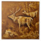 Um majestoso alce guarda o relógio neste azulejo, reproduzido de um original moldado e dimensional de Hamilton Art Azulejo Works. Vestido em um rico castanho com destaques de ouro e creme do processo de fogo. Olhe para o centro da borda esquerda do azulejo e você verá outro animal à distância.