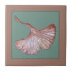 Este é um azulejo Gingko Leaf cerâmico com cobre metálico. O fundo é verde com uma moldura de pêssego. Use isto na sua cozinha, na casa de banho ou na lareira. Se você gosta da natureza e se preocupa com o meio ambiente, isso é para você. Isto é baseado em um azulejo cerâmico feito pelo azulejo de Oregon, Fay Jones Day.
