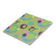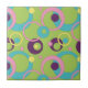 Um fundo verde brilhante é adornado com um padrão estranho de círculos, pontos e anéis numa variedade de cores vibrantes, incluindo rosa, azul, roxo e amarelo. Este azulejo pode ser enquadrado para criar um trivial ou colocar dentro a tampa da caixa de presente de madeira. Azulejos sem um quadro também ajustado a grande caixa de presentes para criar um conjunto correspondente.