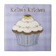Gráficos bonitos de um cupcake de chocolate branco, com girassol em cima, contra fundo azul e branco marcado. O texto marrom personalizado no topo está pronto para personalizar para você mesmo ou como uma ideia de presente de excelente. Excelente enquadrado para a sua cozinha ou como uma trivit.