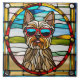 Um óculos de sol vestido Yorkie é retratado em vidro colorido.