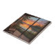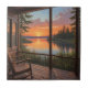 Este azulejo cerâmico apresenta uma cena pacífica de uma cabana em um lago ao pôr do sol. Faz um excelente quente.