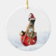Um ornamento cerâmico com fotografia de um boxeador de Brindle num chapéu de Santa