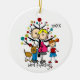 Um casal esperançoso, um rapaz, um cão, uma árvore de férias e um texto que diz "Estamos à espera!" num ornamento bonito que se pode namorar com o ano em curso!