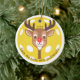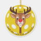 Passe os corredores com o ornamento das bolas de picles. A cabeça e o pescoço das renas têm a forma de um remo, enquanto o nariz vermelho se assemelha a uma bola vermelha de picles. Fundo amarelo-picleball padrão. Personalize com um ano. Mantenha o texto curvado conforme mostrado ou personalize com seu próprio texto. Faz um presente perfeito para os entusiastas de picleball. © Kimbellish, LLC