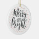 Este adorável ornamento cerâmico de Natal moderno apresenta na moda tipografia "Feliz e Brilho" e gráficos brilhantes em vermelho-coral. Adicione sua foto e texto personalizado no verso. Este ornamento fotográfico será uma decoração de Natal na moda ou um presente de Natal personalizado para a sua família ou amigos. Mais itens e opções de cores correspondentes disponíveis no meu compro BaraBomDesign.
