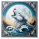 Um design azulejo impressionante apresenta um lobo majestoso uivando em direção a uma lua de cheio, enquadrado por ondas oceânicas girando.
