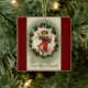 Foto doce e vintage de uma menina carregando cesta e cercada por uma coroa, é apresentada neste ornamento cerâmico, tanto na frente como no verso. Com a mensagem "Saudações no Natal", este adorável ornamento pareceria excelente na sua árvore de Natal ou daria como um presente de Feriado!