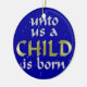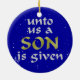 Citações de ornamento de Isaiah 9:6. Um lado diz "Para nós, uma Criança é nascer" e o outro diz "Para nós, um Filho é dado"