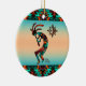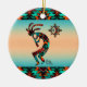 Personalize este Enfeites de natal "Um dos tipos" do sudoeste de Kokopelli! Ele apresenta um Kokopelli Sudoeste tocando flauta e dançando sob o sol num fundo de turquesa e sunset laranja... cercado por turquesa, laranja e fronteiras negras! Design De Arte Original Pelo Artista Kerry Miller.