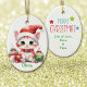 Na frente deste ornamento cerâmico para uma criança é um adorável gatinho de mesa vestindo um chapéu de Papai Noel. Ele tem um grupo de decorações de bolbos da árvore Holiday de cor brilhante ao seu lado. O verso do ornamento tem uma mensagem de Feliz Natal, o nome do seu filho e a sua assinatura. Perfeito para uma filha, filho, neta ou neto, especialmente uma que ama gatos-do-gato!
