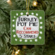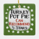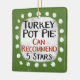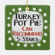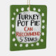 Um design tipográfico engraçado que diz "Turca Pote Pie: Pode Recomendar, 5 Estrelas". É um texto preto e vermelho em um retângulo branco com pontos brancos engraçados e brincalhões ao seu redor, tudo em um fundo verde.
