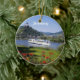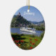O ornamento de Alemanha mostra uma casa flutuante na água pelas montanhas com as flores no primeiro plano.