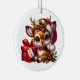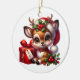 Este ornamento cerâmico da árvore de Natal é apresentado em forma redonda com um impressão de veados de Natal festivos. Personalize este item ou comprar como está. Impressão licenciado
