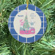 Um adorável ornamento de Natal, que apresenta uma ilustração retro-química de dois filhotes de ursos polares que decoram uma árvore para os Feriados na frente e um padrão de grelha azul e creme no verso. Personalize-o com o nome da criança e o ano. Você também pode adicionar uma foto de bebê no verso usando a ferramenta do editor. © ArianeC Ilustrações — Todos os direitos reservados