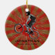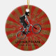 Ornamento Personalizado do Extreme Biker Natal 20XX. Um motociclista fazendo uma caminhada contra um fundo vermelho e dourado de explosão de estrelas. Todo texto personalizável, frente e verso!