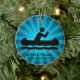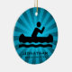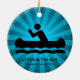 Canoagem Personalizada do Ornamento Natal 20XX. Uma canoa em movimento contra um fundo ondulado e azul de explosão de estrelas. Todo texto personalizável, frente e verso!