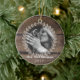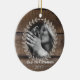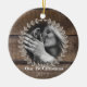Este maravilhoso e rústico ornamento de fotos personalizado apresenta um fundo de madeira rústico e valorizado, com uma bela coroa em estilo de fazenda rodeando qualquer foto personalizada de sua escolha. Duas linhas de texto na parte inferior permitem espaço para nome, data ou mensagem de sua escolha. "Nosso Primeiro Natal"