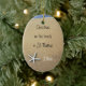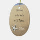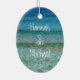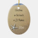 O ornamento de férias tropicais mantém-se personalizado com informações pessoais. Imagem de fundo da areia da praia e da água do oceano.