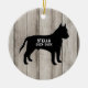 Pit Touro, ornamento ruidoso de madeira com silhueta fofinha contra fundo de madeira falsa. Personalize com o nome do seu cão e o ano. Você também poderia usar isso como um ornamento memorial, mas mudando ano para nascimento/morte. Outras raças e padrões estão disponíveis em nosso compro (veja o link de coleta para outras raças/cores) e me informe se você não consegue encontrar sua raça: info@lemontreecards.com