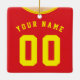 Fácil de editar futebol / futebol / ornamento de festas de camisa esportiva, basta usar as caixas à direita da imagem para inserir seu nome e número no verso. Esta camisa é vermelha com a faixa lateral branca e amarela na frente, com uma coleira vermelha e amarela. A cor 'skin' do plano de fundo pode ser alterada, basta clicar em 'PERSONALIZAR'. Se você quiser um design personalizado feito em um esquema de cores específico, entre em contato comigo usando o link 'Contate este Designer' abaixo. Ornamentos únicos, personalizados, personalizados, perfeitos para qualquer feriado ou celebração, seja Natal, aniversário, Chanucá, casamento e muitas outras ocasiões! Ideias de presentes de excelente para o fã ou jogador esportivo em sua vida.